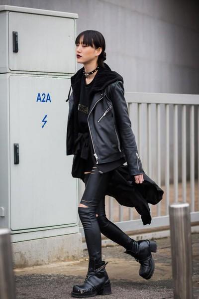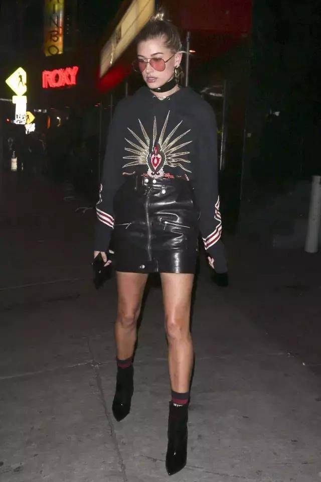 The black sweatshirt with fashionable print decoration is fashionable and very lively, easily breaking the dull feeling of black tone. The simple round neckline modifies the slender curves of the neck. The hem is tucked into the skirt to highlight the slender figure. Paired with a leather skirt, the front zipper design is fashionable and western-style, combined with a hip-hugging cut. Outline the slender figure. Wear a pair of black pointed-toe short boots to show off a strong street trend, and wear handsome sunglasses to show your unique fashion beauty