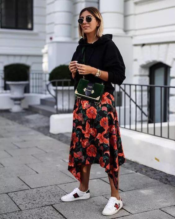 Hooded sweatshirt with pullover design, The classic pure black is chosen as the theme body, which is fashionable and simple, and it also looks very flattering on the skin tone when worn. The cuffs are slightly rolled up, making it comfortable and comfortable to wear. The lower body is paired with a mid-length skirt decorated with colorful prints. The skirt has an irregular design and is 100% fashionable. feet�Wear white shoes to show your freedom