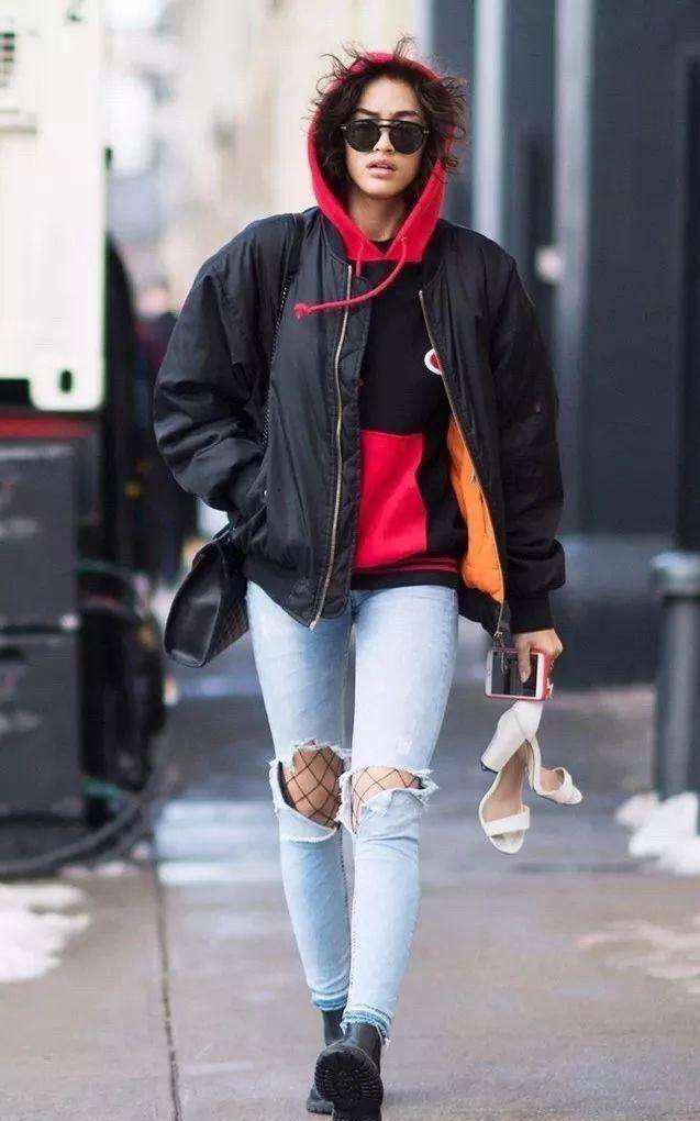 The red and black hooded pullover sweatshirt has a college style feel and the loose fit is suitable for fat and thin people. The girl’s figure. Wear it with a black jacket to double your comfort, and the front zipper can be opened casually to create a casual and comfortable feel. The fishnet ripped jeans on the lower body look fashionable and modern, and the black short boots on the feet show a casual street style. A black crossbody bag can easily convey a comfortable travel experience