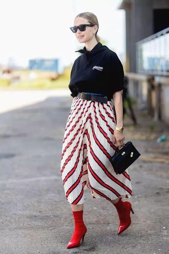 The black sweatshirt visually looks slimmer and complements the skin tone. No wonder it has always been liked by many girls. The loose version is not picky at all, and the contrasting color pattern embellishes the chest, making it full of fashion. The lower body is paired with a long skirt decorated with red and white stripes, which is full of elegance. The waist is embellished with a black buckle belt, which outlines the slender waist, and the eye-catching red pointed high heels on the feet show a full sense of fashion. A small black handbag creates a comfortable and comfortable travel style