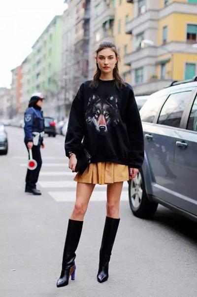 Strong animal heads are dotted on the front of the black sweatshirt, breaking the monotony of solid colors and bringing a different kind of fashion. It perfectly fits the neck of a small round face, is comfortable and generous, and modifies the slender curves of the neck. The loose body is not flattering to the body shape, and the lower body is paired with a brown skirt. The pleated skirt is cut to reveal the beautiful slender legs. Accompany it with a pair of black pointed high-heeled boots and a classic black bag to show your strong street style.