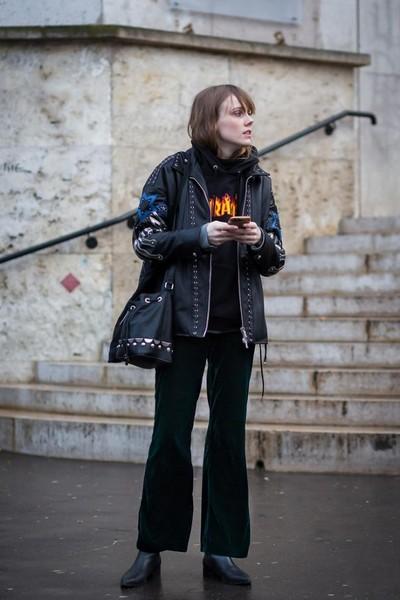 Cool and eye-catching prints are embellished on the black sweatshirt. It is simple and elegant, and the hooded design modifies the slender curve of the neck. Wear it with a casual jacket to make you feel more at ease. The fly is designed with a zipper, making it comfortable and convenient to open and close. Wearing a pair of slightly flared black trousers on the lower body, it is full of fashion. Wearing black short boots on the feet shows a strong street atmosphere. A black crossbody bag shows a sense of freedom and casual travel