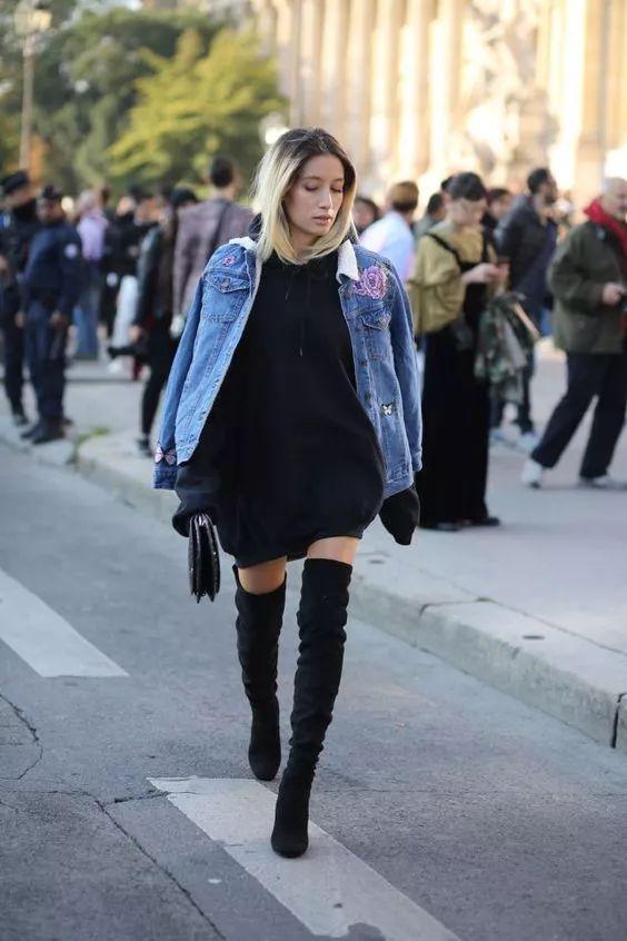 Mid-length black sweatshirt, fashionable and simple And it adopts a hooded design, which looks very age-reducing. The neckline is decorated with ties, which accentuates the slender curves of the neck. Wear it with a denim jacket with exquisite prints, making it look youthful. The lower body is paired with a pair of black over-the-knee boots to accentuate the slender legs. A black clutch bag adds a lot of points to the overall look