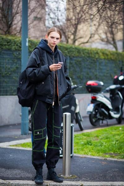 Sweatshirts and jackets seem to belong to the same family. The same color is full of casual flavor, and can also show full of vitality and vigor. The black hooded sweatshirt is worn as an inner layer, looking comfortable and simple, and a black jacket is worn outside. , full of layering. A pair of ankle-length trousers with contrasting stripes, showing a strong sports style, paired with casual shoes on the feet, full of freehand feeling, and a casual black bag also adds a lot of casualness Breath