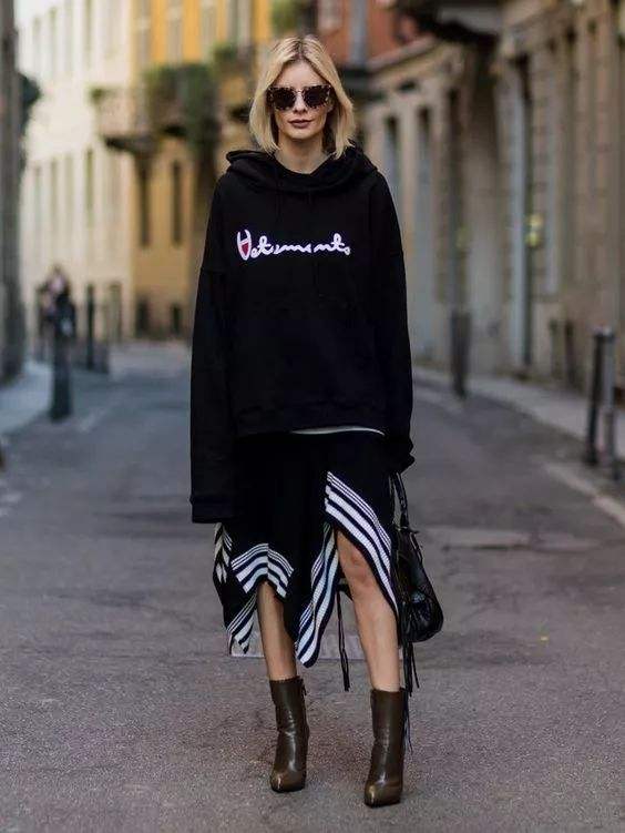 Black sweatshirt is synonymous with leisure and is suitable for different Wear it according to the occasion and age. A little print embellishment on the body will immediately increase your sense of fashion. The simple hem and cuff cuts make it comfortable and comfortable to wear. The black and white striped skirt on the lower body and the asymmetric design of the skirt are very fashionable. Pair it with a pair of brown pointed-toe boots to reveal your slender legs, and a black handbag to show your elegant ladylike style