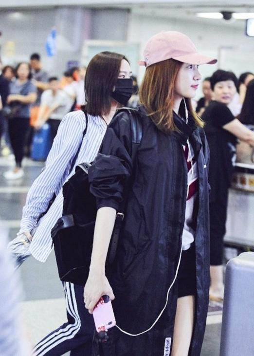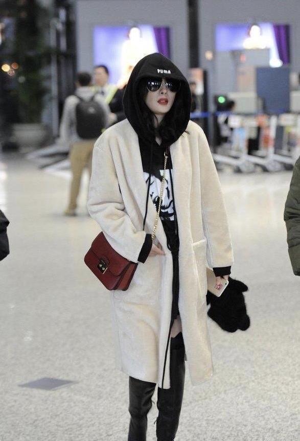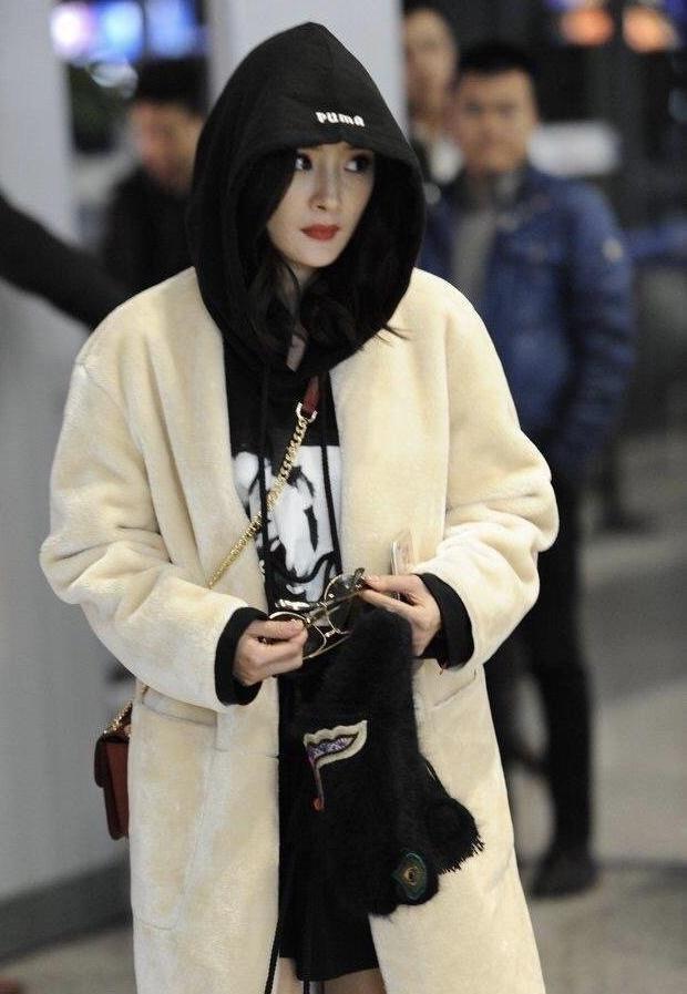 The black printed sweatshirt is paired with a white coat. The color alone is very visually impactful. The generous look with the hat of the sweatshirt makes Yang Mi look younger even more.