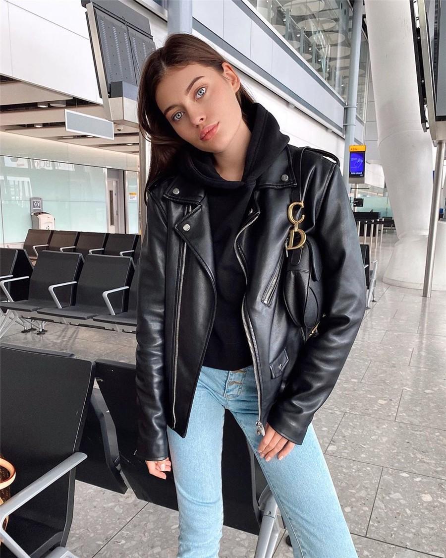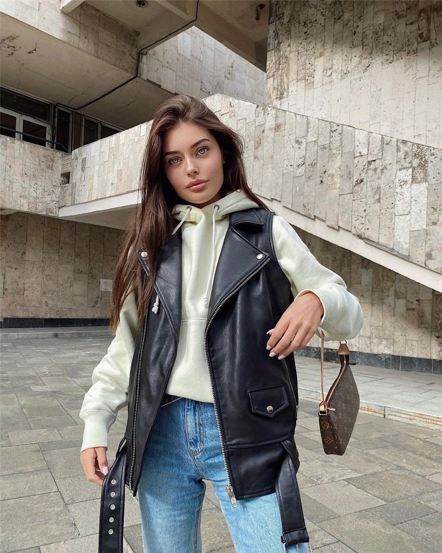 Youthful sweatshirt and handsomeness The leather jackets seem to be two different styles, but when they collide together, they have a strong aura. The sweatshirt + leather jacket without any sense of contradiction is definitely a magical CP that cool girls cannot miss.