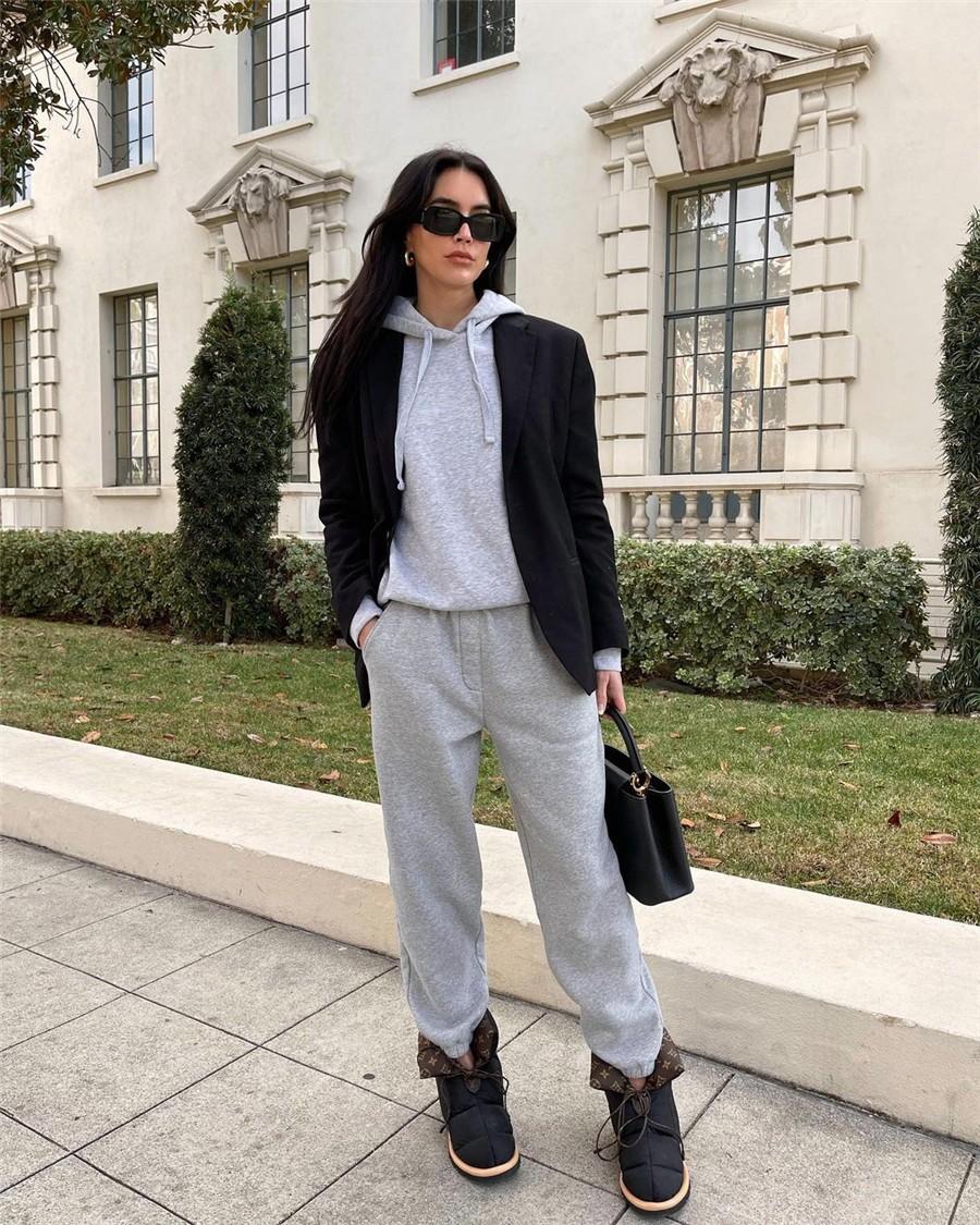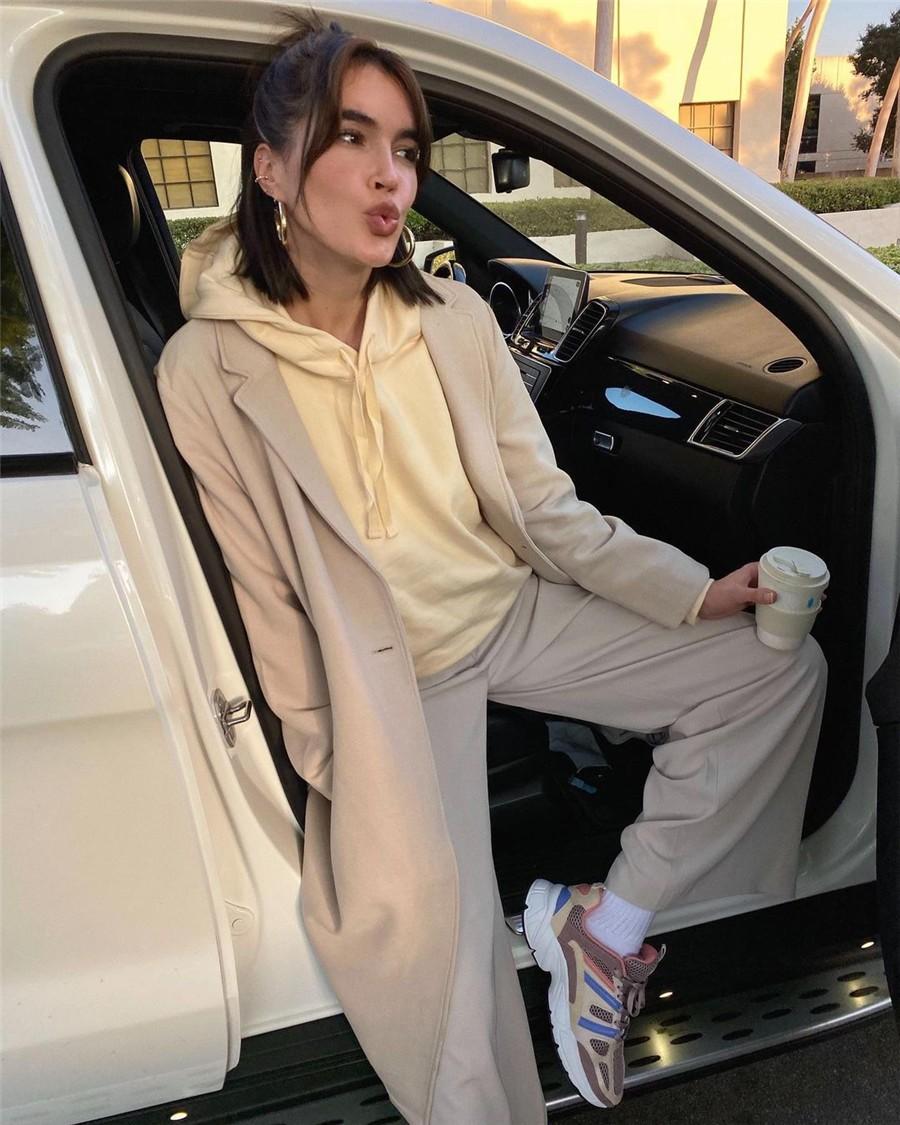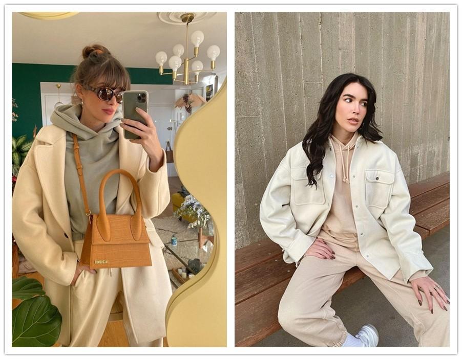 Coat + sweatshirt combination In addition to differences in elements, the colors of sweatshirts can also create various styles. Compared with ordinary black and white sweatshirts, more low-key gray sweatshirts and warmer khaki sweatshirts are good choices, with white linings. The two colors of skin are also particularly elegant.