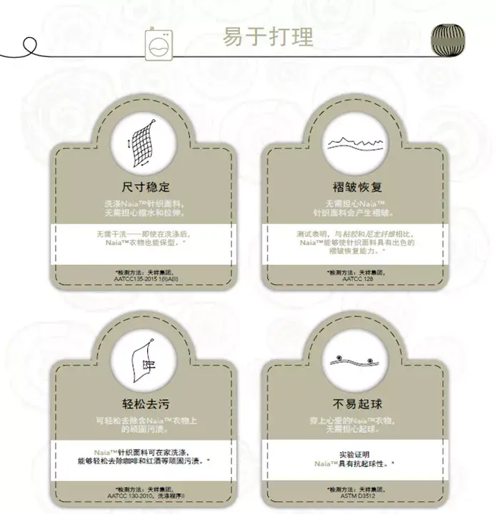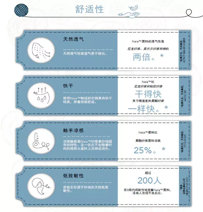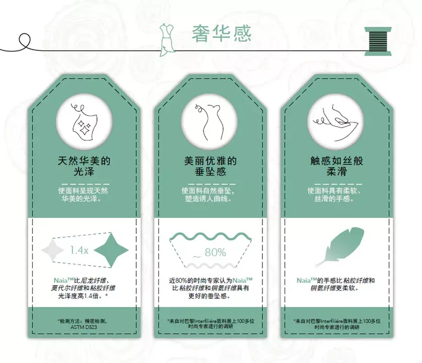 In terms of product life cycle, Naia™ fiber has a bio-based content of 59%, is biodegradable (has obtained freshwater degradability certification), and the life cycle assessment results certified by a third party comply with the ISO 14044 standard. , is an OEKO-TEX 100® Level 1 certified product and is included in the Higg Material Sustainability Index.