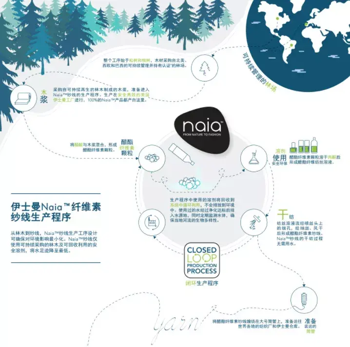 In terms of the production process, Naia™ fiber is made by a safe closed-loop process. The solvent used in the process is recovered into the system and recycled without being discharged into the environment. The production water is discharged into the water source area after being purified to meet standards, and the water body is regularly monitored to ensure the biodiversity of local rivers.