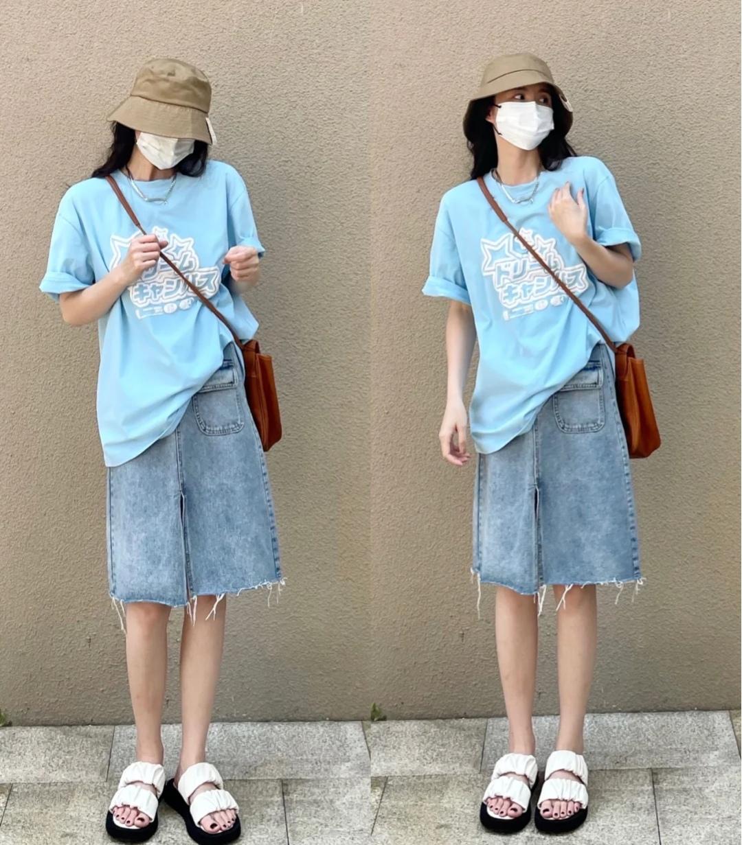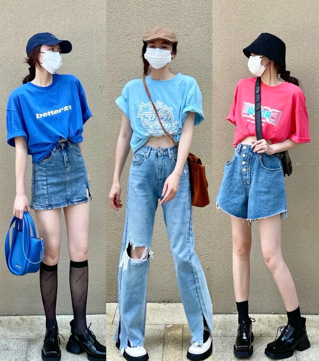 It is said that girls are detail-oriented. By making a few small adjustments to a basic T-shirt, you can have a unique style. Folding the cuffs of a T-shirt up into two layers is also a fancy way to wear it. This simple trick removes the boringness of a basic T-shirt. Proper tightening can also highlight your figure. The bottoms can be paired with a skirt, which can be casual or sexy. The tops can be tightened and tucked into the skirt. It is a classic combination that makes you look taller and slimmer. It is very practical no matter how tall or thin you are!