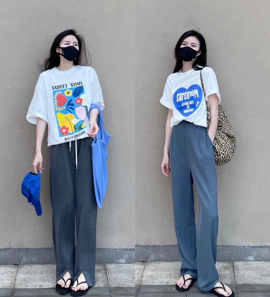 White represents refreshing and pure, It is an essential color in every girl’s summer wardrobe. White printed T-shirts are simple and lively, full of youthful vitality in summer. If you want to make an ordinary T-shirt look good, the key is to choose and match the bottoms. Lazy and casual floor-length pants are an excellent choice. The overall style is loose and casual, simple and elegant, without any sense of restraint. To focus on the key point, just take the circled part of the T-shirt and tuck it into the trousers, without tightening or putting it down, and the natural laziness will be highlighted.