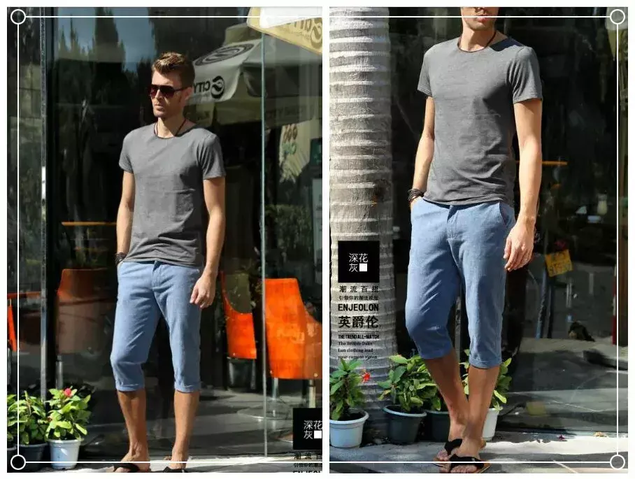 For men, black and white T-shirts are the most flattering What I wear is a gray T-shirt. In fact, gray is a relatively high-end color, so I don’t have to pay much attention to the matching. The top is a pure gray T-shirt, with a fashionable and casual version and the lower body is blue. Paired with five-quarter trousers, the collision of different colors makes the whole look even cooler and more handsome.