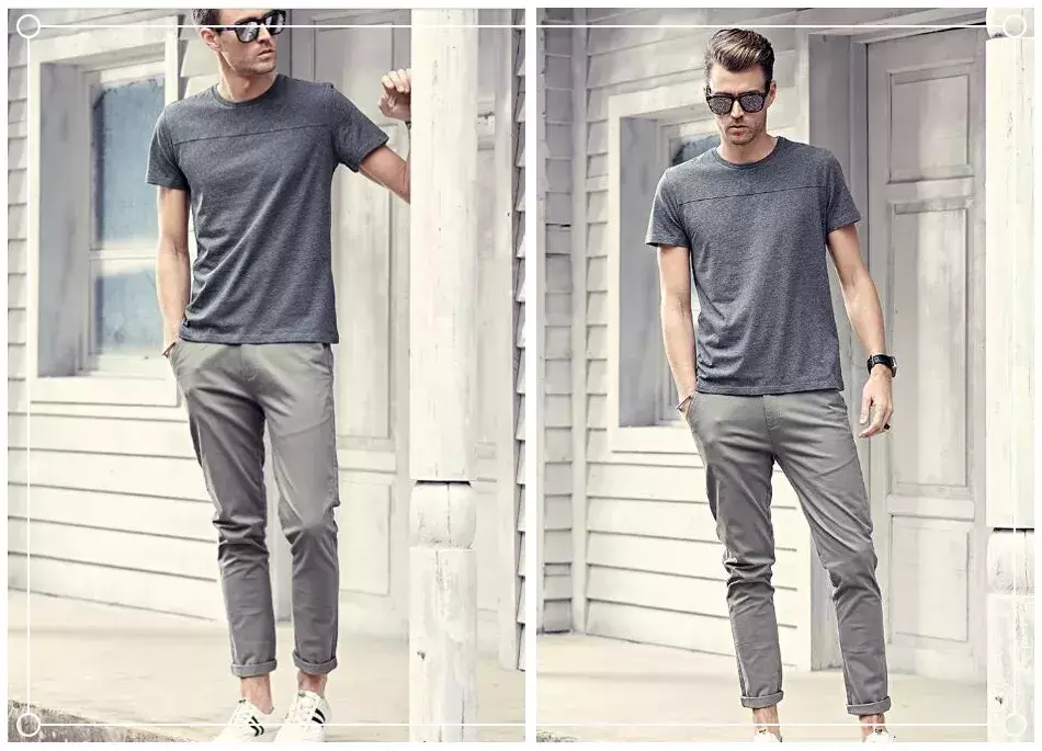 Although gray gives people a slightly more advanced feeling, In terms of matching items, it can become the best CP with any combination. The natural and casual pure gray T-shirt is paired with the light gray nine-point pants on the bottoms. The combination of one dark and one light color makes people feel It feels more fashionable and casual for modern men.