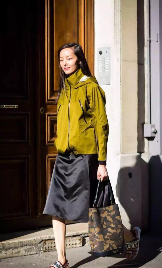 Jackets and skirts are two fashion styles with completely different styles. Combining them together can create sparks of style and fashion. The grass green stand-up collar jacket is cool, free and easy, fashionable and warm. The pure black skirt on the lower body is low-key and stable, but has an elegant and fairy-like beauty. A pair of sandals on the feet add a casual and leisure atmosphere. The hand-held camouflage design leather bag exudes elegance and charm