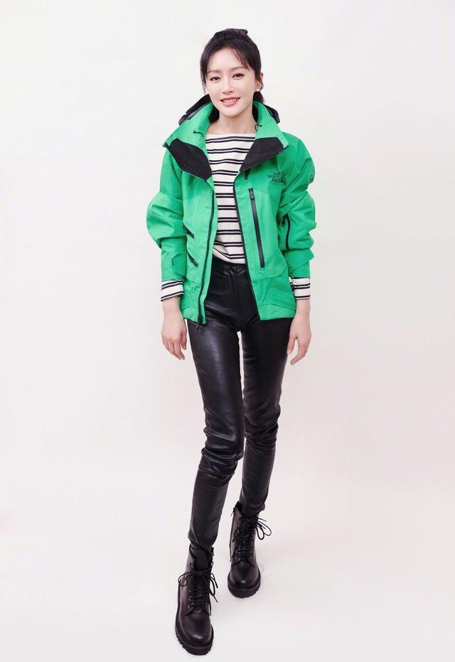 Qin Lan’s jacket with green as the main color gives people a A dazzling visual impact. The fusion of fluorescent green and black creates a free and refreshing charm. Pair it with a black and white striped round-neck bottoming shirt, which is casual and feminine. The lower body of the black slim-fitting leather pants is domineering and high-end fashion, and the mid-calf black leather boots have a very elegant and high-end texture