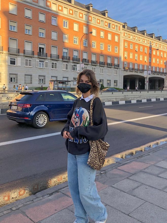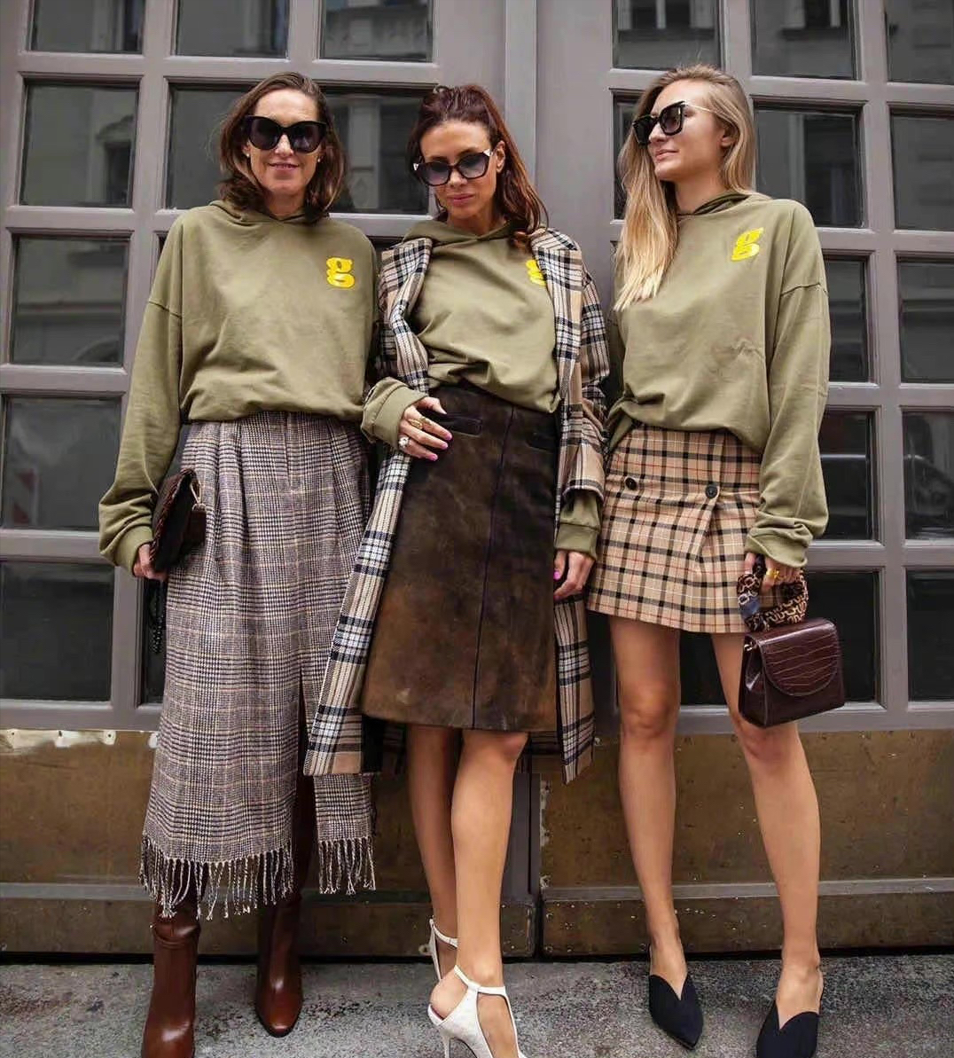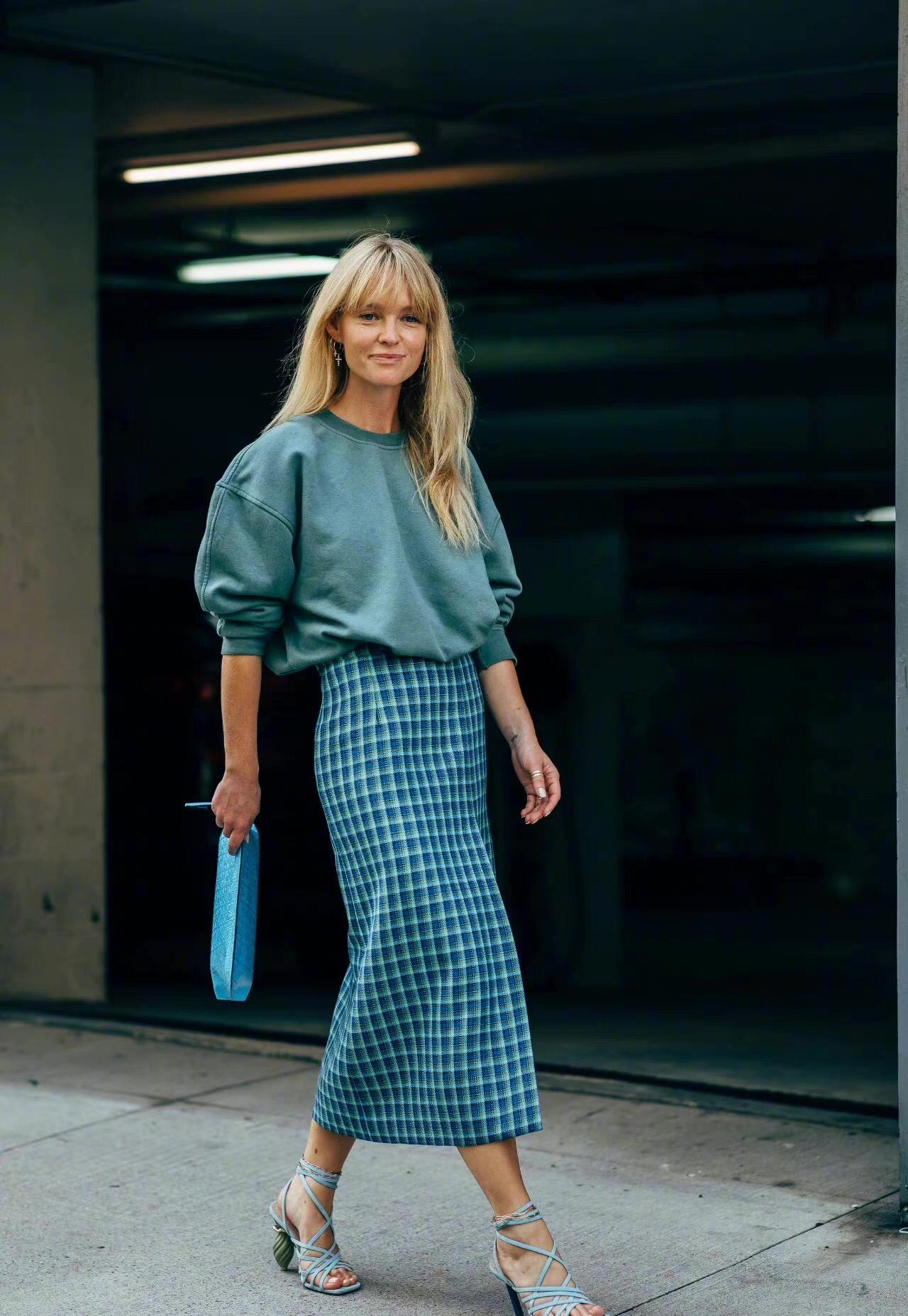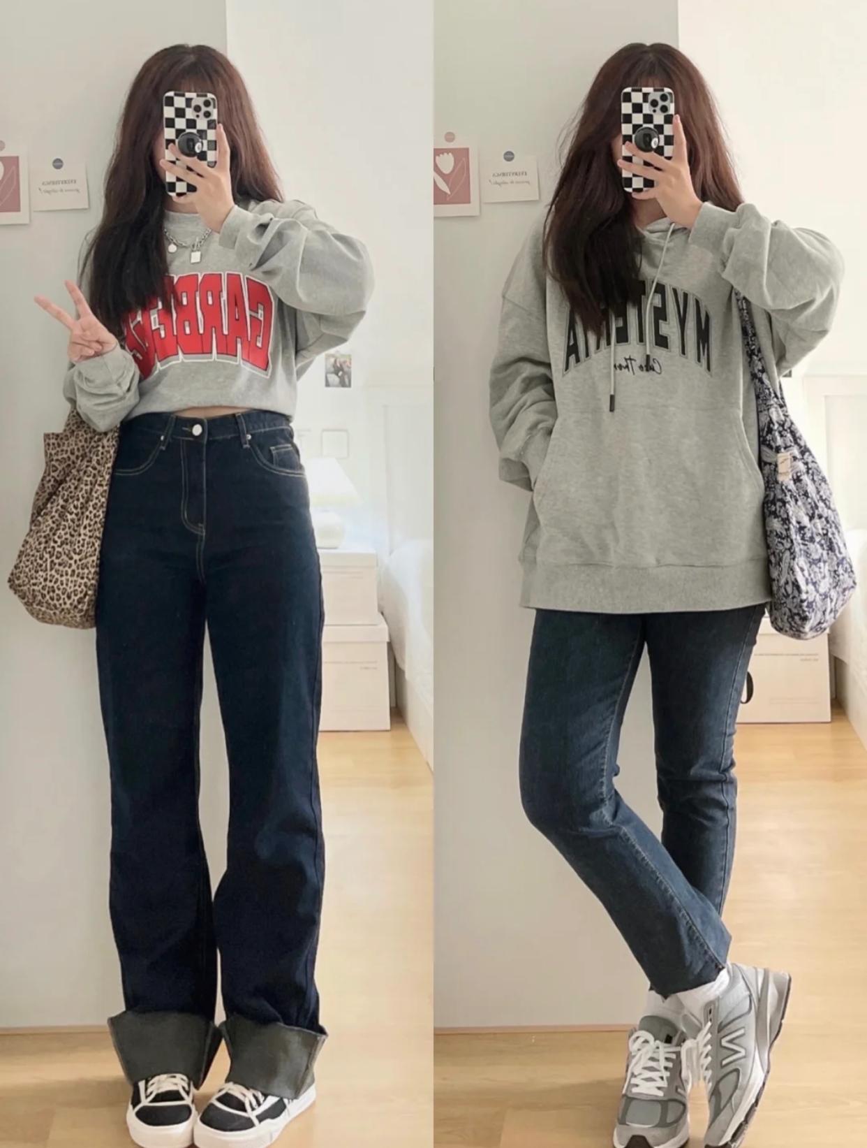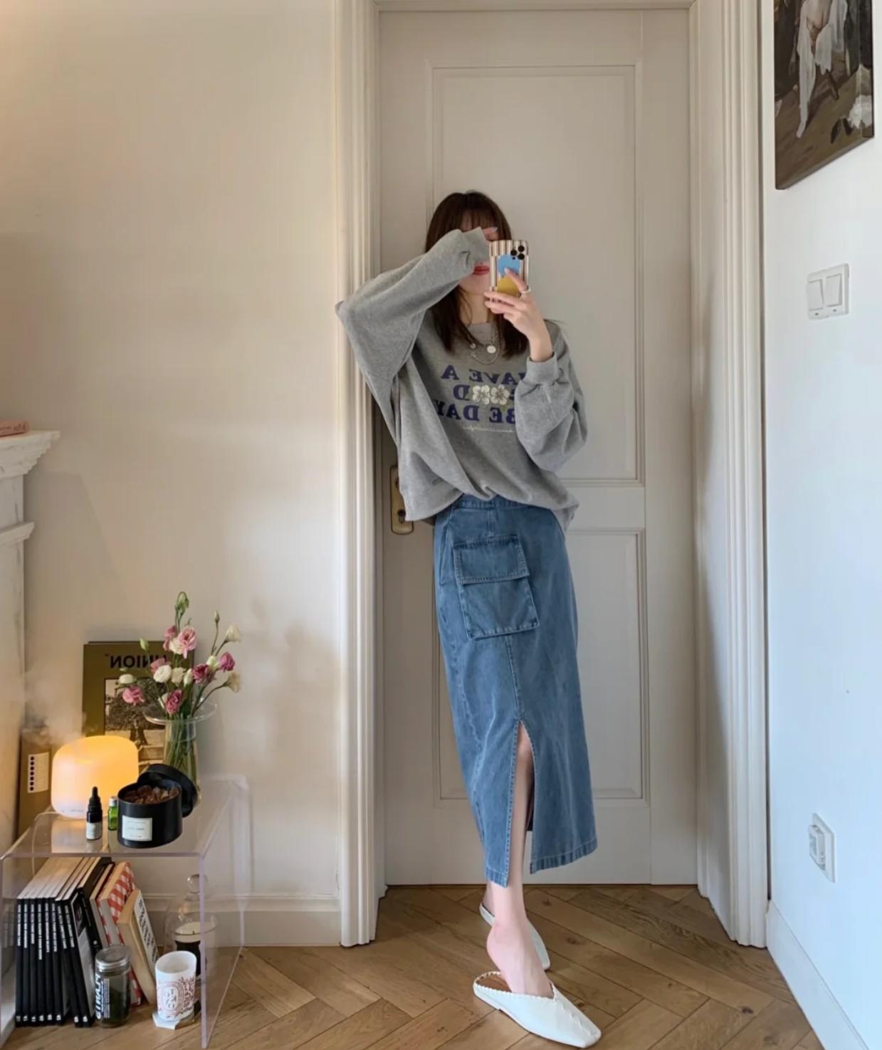 My personal favorite is sweatshirt + denim mid-length skirt, gentle and artistic, It has a Korean feel and is very nice when going out to work on the street.