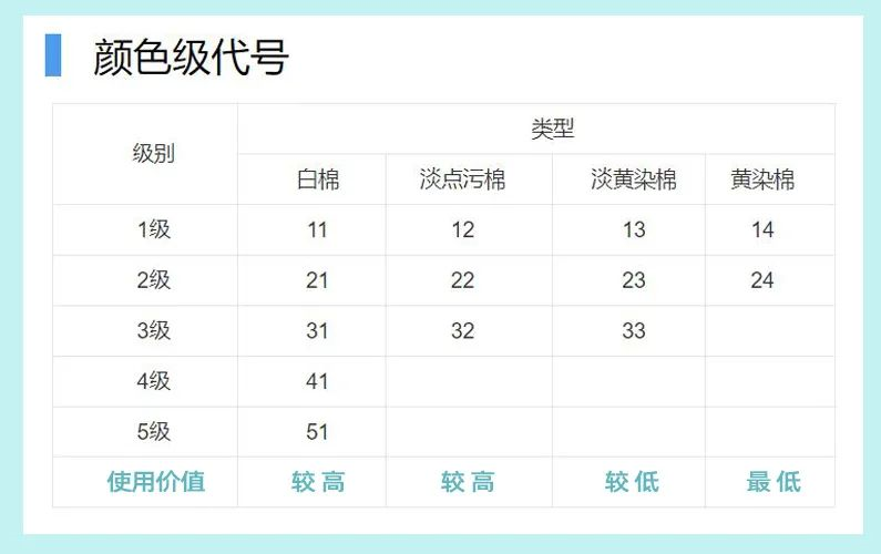 Color grade is an indicator used to judge the type and level of cotton color, where the type is based on the depth of yellow (+b) determined, the level is determined according to the degree of lightness and darkness (Rd), divided into 4 types and a total of 13 color levels, namely white cotton level 1 to level 5, light spot stained cotton level 1 to 3, light yellow dyed cotton level 1 to 3, Yellow dyed cotton is grade one to grade two, among which grade three white cotton is the standard grade.