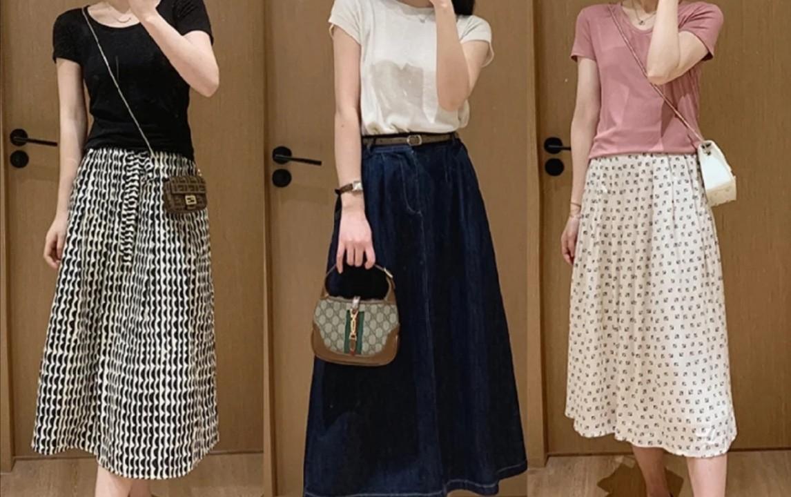 2. T-shirt + knee-length skirt, more elegant