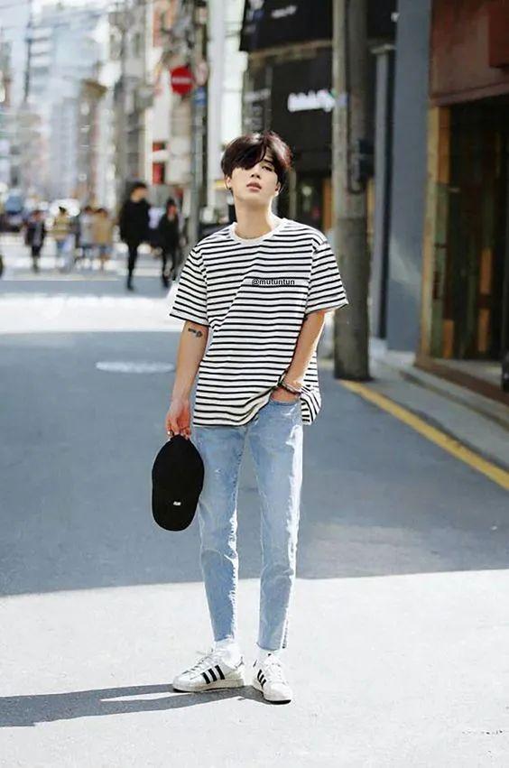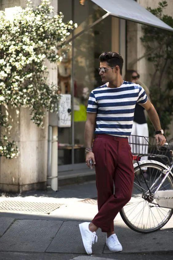 Some candy-colored stripes create a more fashionable look. If the color of the stripes is brighter, then when paired with pants, it should be simple and simple. Take some. The red and blue style is paired with jeans and sneakers, and a baseball cap to make it look very trendy.