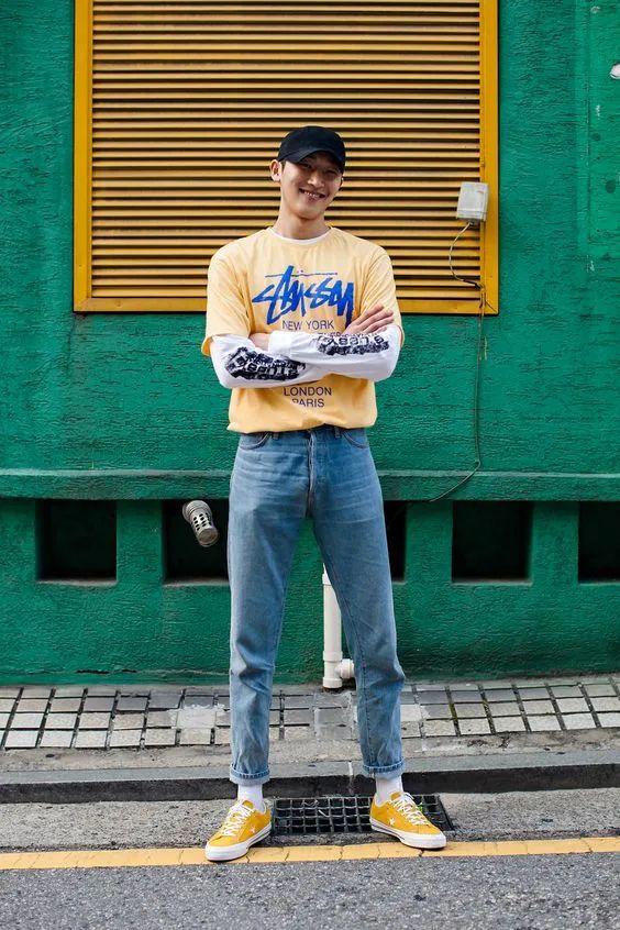 The bright colors and eye-catching logo make the style more individual and fashionable. A yellow T-shirt is paired with a pair of light blue washed jeans. The color tone of the shape is very overall, and the matching of shoes and socks makes the shape more fashionable and rich.