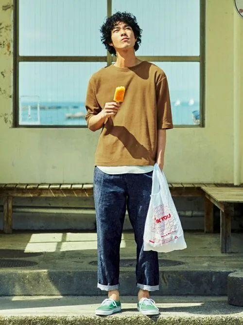 The camel T-shirt is paired with a pair of dark trousers, and the style also looks very artistic. The style is simple yet fashionable, plus a pair of skate shoes The styling can also show off your fashionable style.