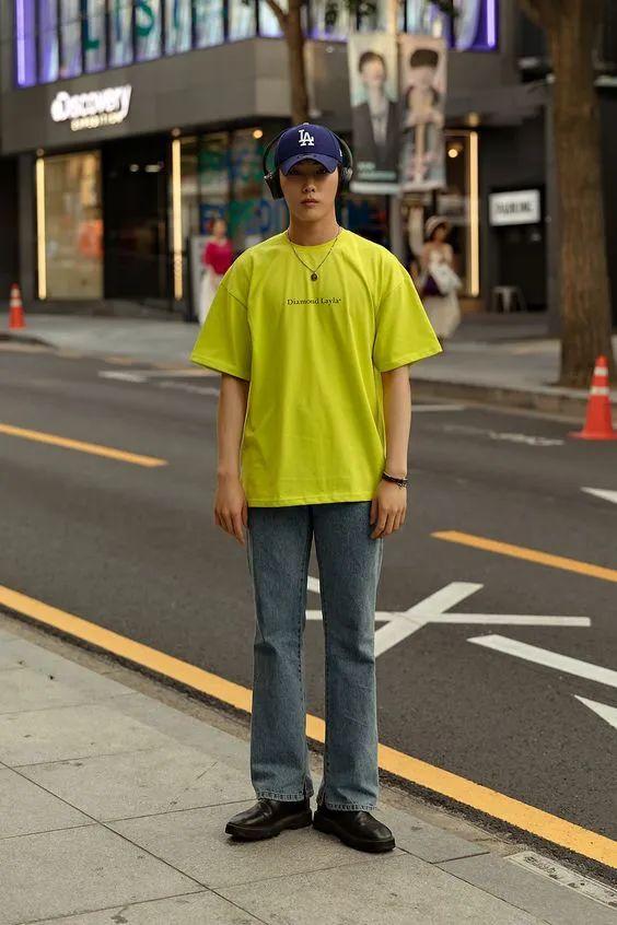 Being able to wear brightly colored styles will make your style more attractive and give people a youthful atmosphere. Fluorescent green is also a very popular color in recent seasons. It is used in various fashion items. The trendy color of T-shirts and the loose and dropped shoulders make the look instantly fashionable.