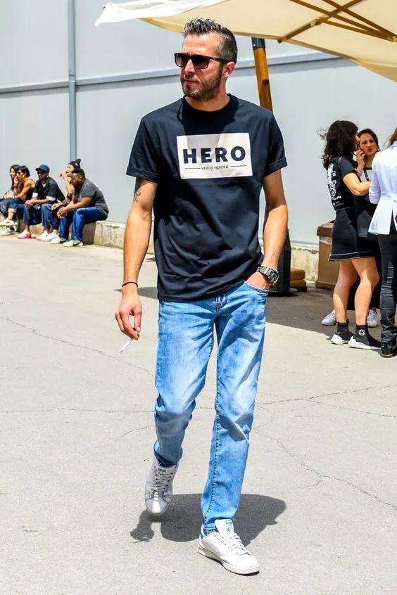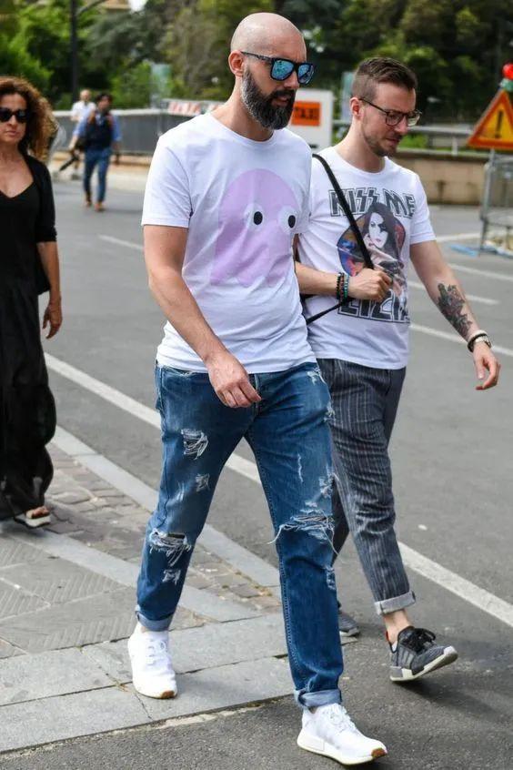 A white T with a character pattern, paired with a pair of light-washed jeans and a pair of skate shoes, the look is full of retro street style. In the elegant toned style, the graphic T-shirt also looks very eye-catching, becoming the visual focus of the style.