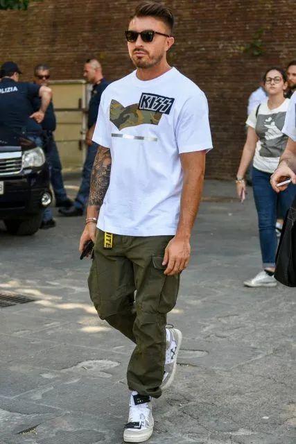 The camouflage printed pattern style, paired with a pair of military green cargo pocket pants, makes the overall look fashionable. The pattern and pants echo each other to make the look more stylish. Outstanding, the color of the shape itself is also handled very well.