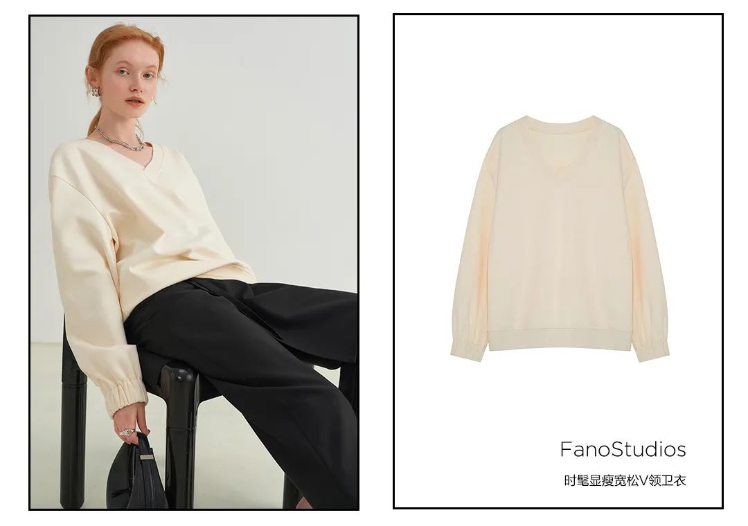 V-neck sweatshirt, the editor recommends that everyone wear one. Wearing it alone will make your face smaller, exuding a casual and lazy temperament, which is very exciting. Even if it is colder, it is no problem to layer it with a jacket, and it can also be paired with a necklace. Just the right decoration, it’s a figure-friendly version!