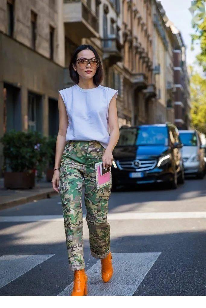 Camo casual with strong military green color Trousers are handsome and modern, perfect for showing street style. Combined with a fresh white shoulder-padded T-shirt, it is simple and elegant, and can also bring out the fair skin tone. Accompanied by a pair of bright-colored short boots, it can bring out the visual focus on details.