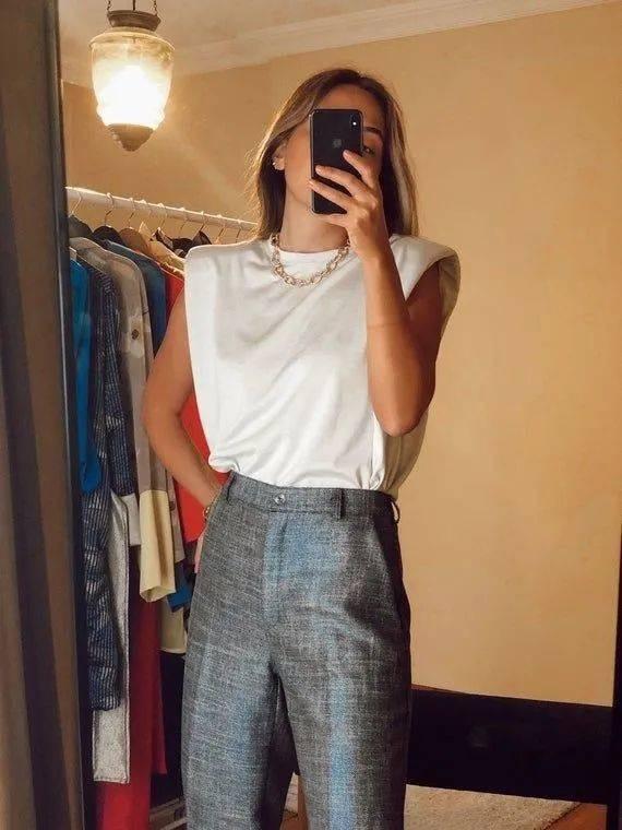 Shoulder-padded T-shirts are very popular when matched with the same color. For women who don’t know how to wear them, they can wear them to show their own elegant soul. , the simple and direct combination shape perfectly unifies the beauty of leisure and harmony.