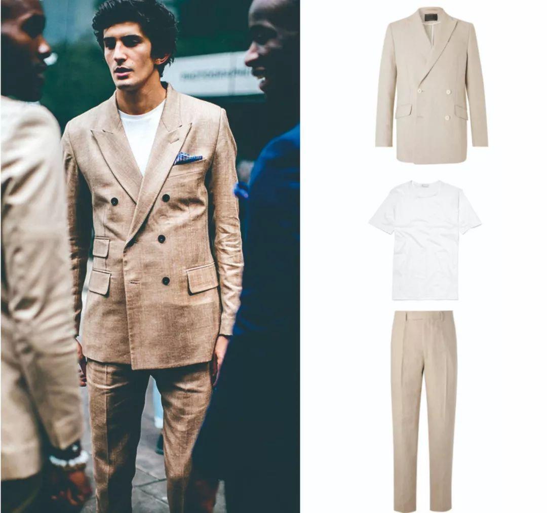 There is no sense of incompatibility when paired with a white T-shirt and a suit. On the contrary, it makes the look relaxed and easy-going. When paired with White shoes or brown leather shoes are both appropriate.