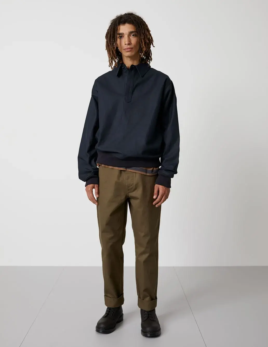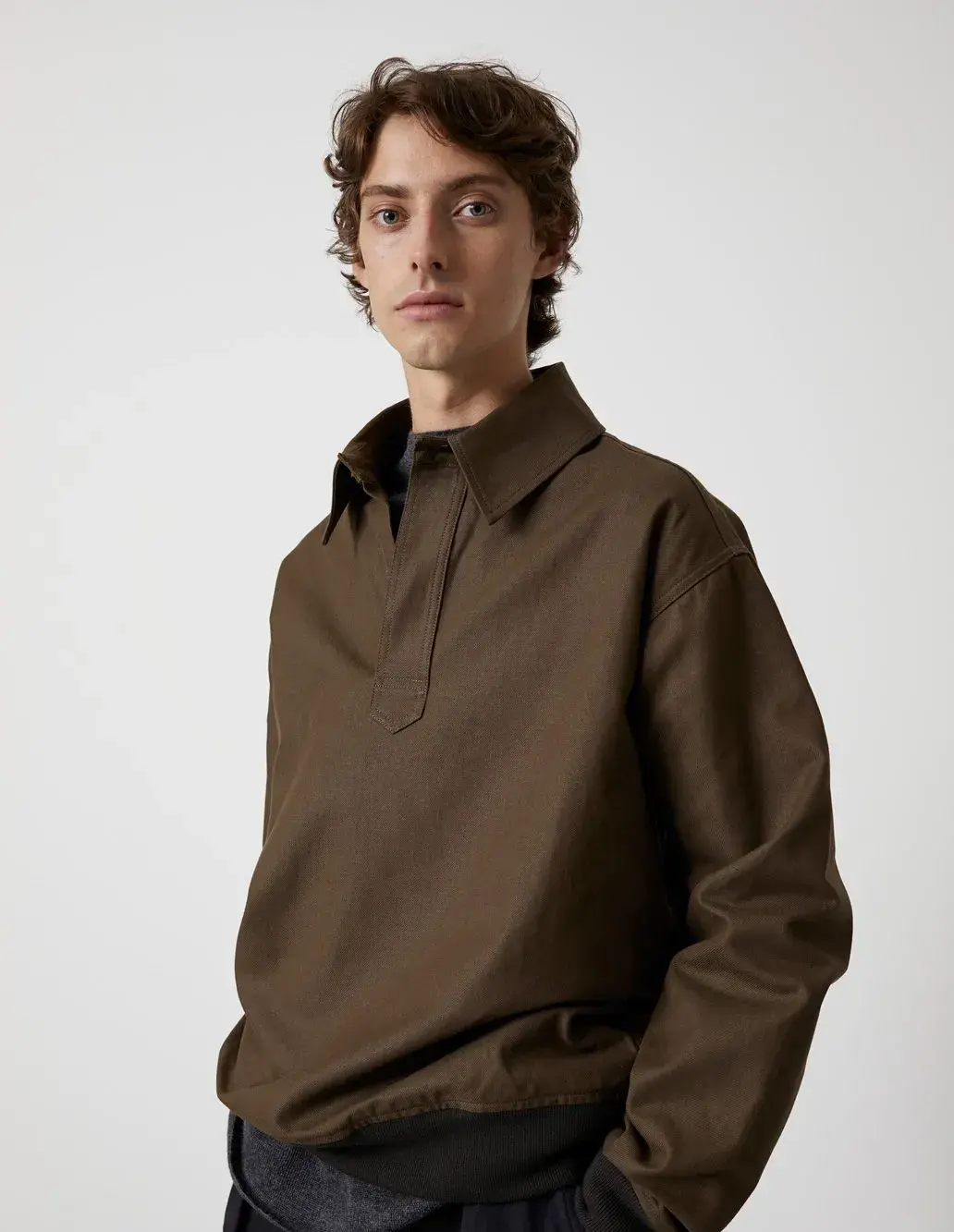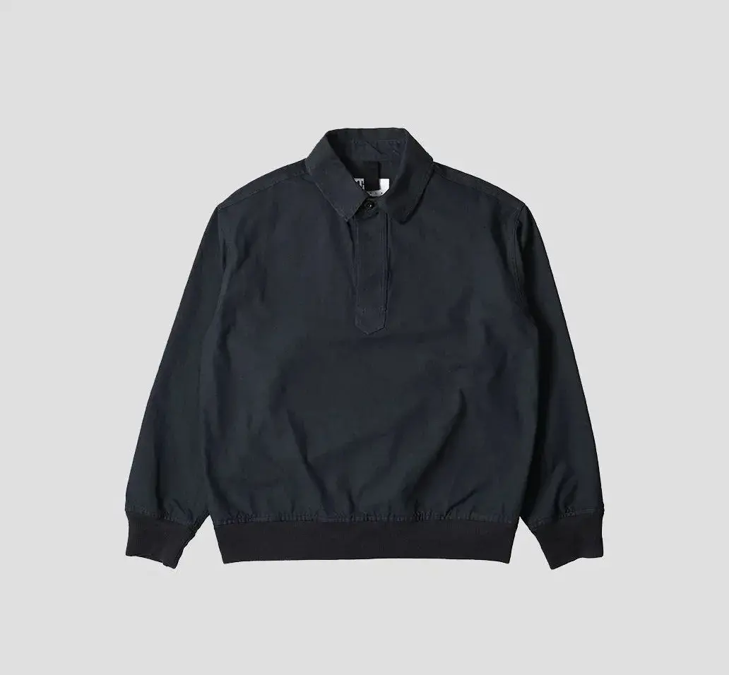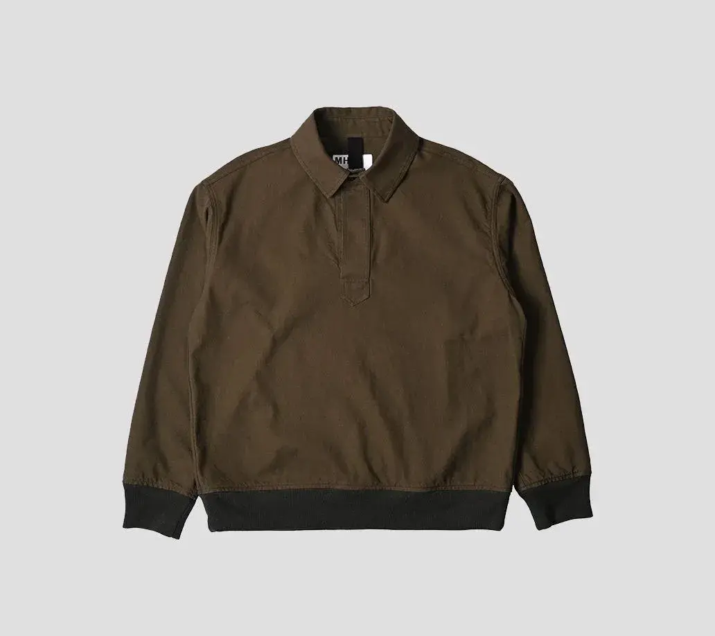 This workwear twill cotton Polo from the British brand Margret Howell’s branch line MHL. has a dropped-shoulder silhouette like a pullover jacket, showing a relatively relaxed and casual wearing atmosphere than the main line products.