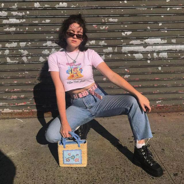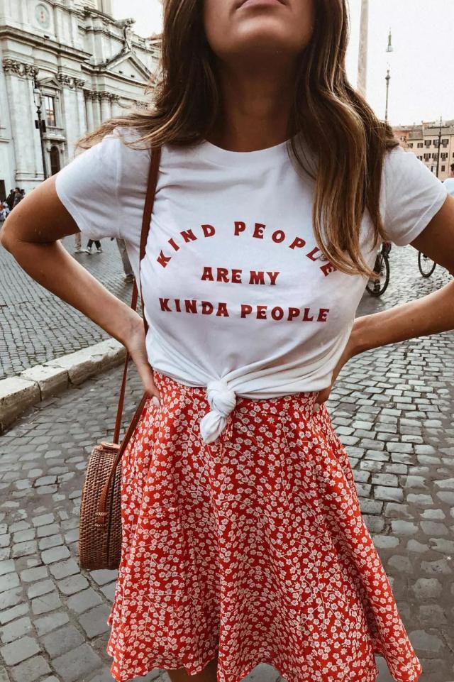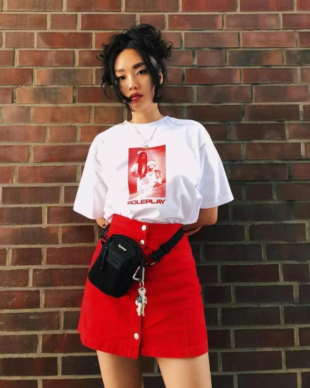 Another advantage of the printed T is that when matched with the lower body , the color of the item can echo with the print of the T-shirt on the body, and the overall look is very harmonious and unified.