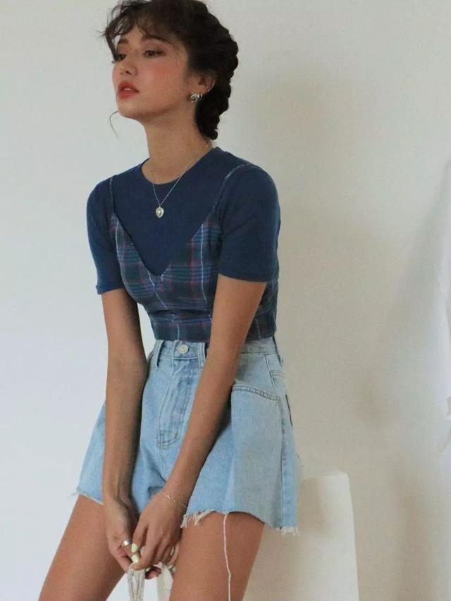 Don’t worry if you are a little fat, because this short T-shirt The hem actually does not reach the lower abdomen, but is a little above the waist (the thinnest part), so it can also be worn with an A-line skirt that can hide the belly.