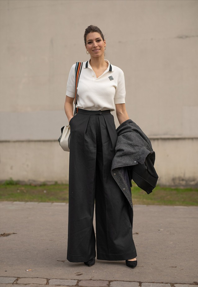 Commuting attire can be paired with ultra-loose wide-leg pants or bell-bottom pants, which look casual and fashionable. Knitted POLO shirts are more slim-fitting, while trousers are chic and elegant. The slenderness of the body shape can be revealed during the comparison of styles, and the body proportions will also be beautified.