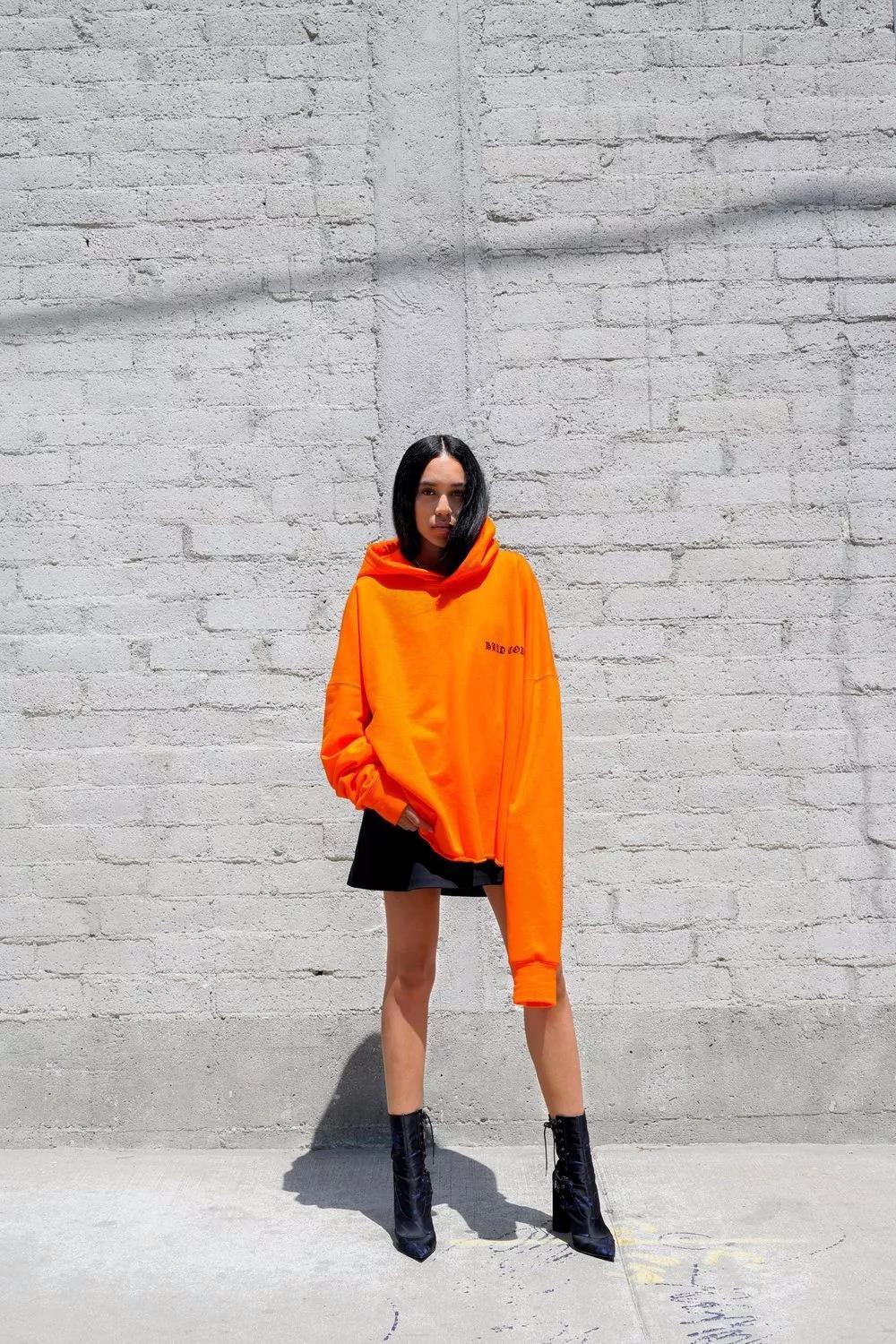 A sweatshirt is a silhouette item, especially this loose-fitting sweatshirt. Matching the lower body with a tight-fitting item will make you look slimmer! The bright and flamboyant orange sweatshirt is distinctive, dazzling, and very age-reducing. Paired with a black leather skirt and black short high-heeled boots, it is beautiful, handsome and explosive! A youthful and age-reducing outfit.