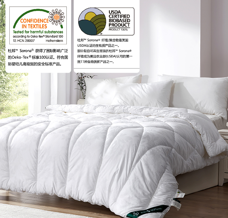 Tests by the authoritative organization Intertek show that for products of the same specification, the thermal insulation performance of DuPont Sorona fiber is much higher than that of hollow polyester and down. It is quite close to the performance of down fiber. In the south where there is no heating, one bed is enough to keep you warm.
