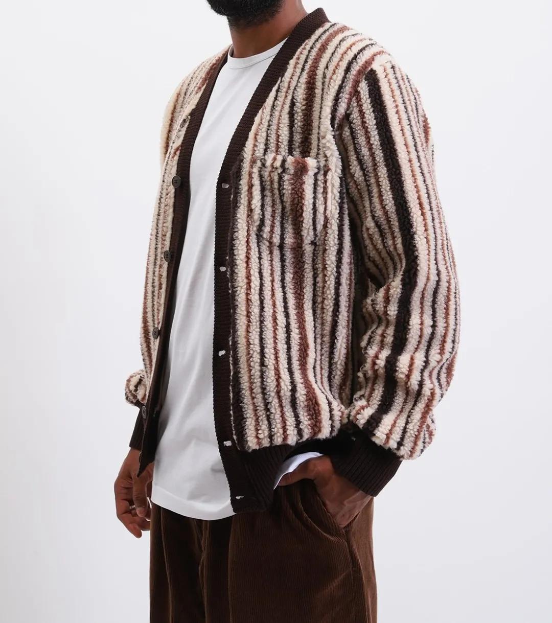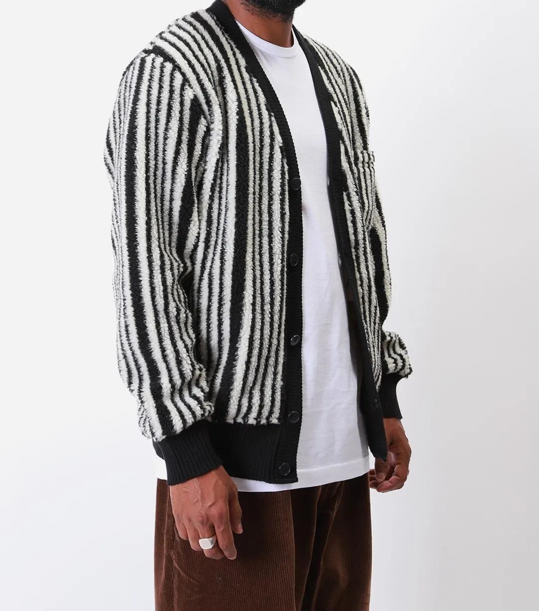 There is a polar fleece cardigan decorated with python stripes It just suits my taste. It is available in black and white and brown and white colors. It is made of 100% polyester fabric and has contrasting threads sewn on the placket, collar, cuffs and hem to outline a striking silhouette.