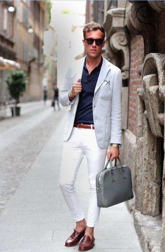 Because it is summer, most dressing tutorials will recommend choosing a brighter suit jacket, which will give people a lighter overall feeling. At this time, when choosing the inner Polo shirt, you can consider a slightly darker color, such as navy blue, which is a very versatile choice.