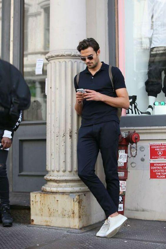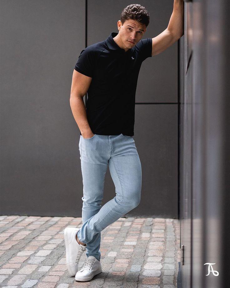Light-colored jeans are suitable for matching with darker polo shirts. The purpose is to create a visual effect of “combination of dark and light” and optimize the overall colorDepartment, this kind of outfit in summer has the atmosphere of a summer man.