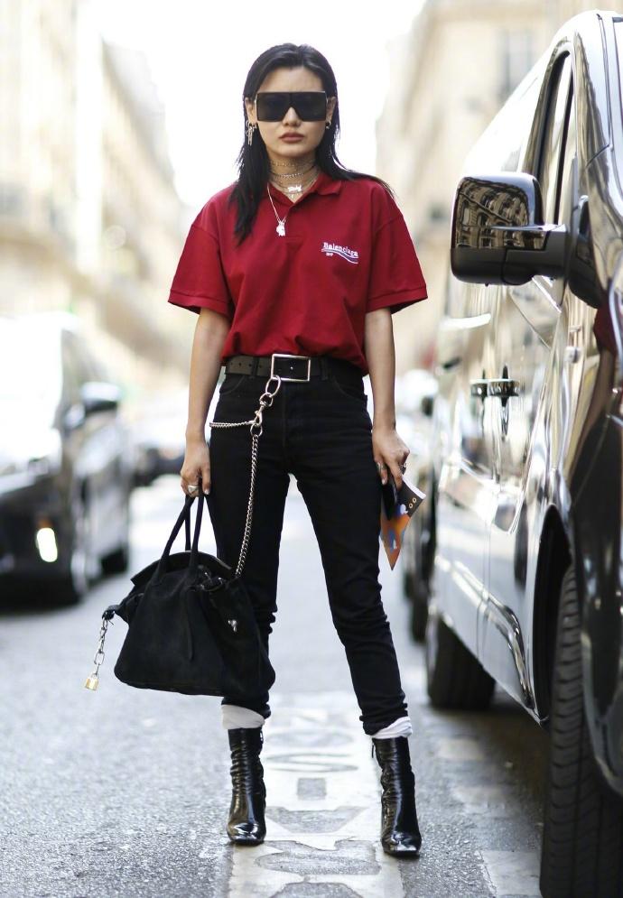 Girls’ series of Polo shirts, with individual earrings to show off the freshness, paired with a black skirt and black boots, full of personality.