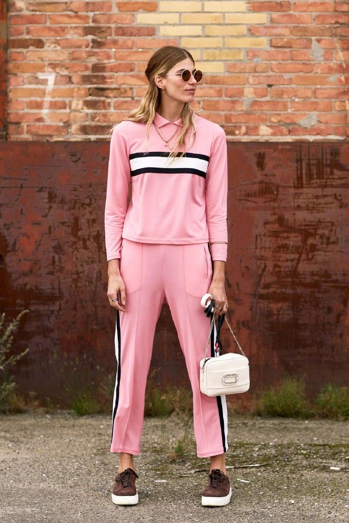 A pink suit with a Polo shirt and sneakers, long-sleeved trousers and long-sleeved trousers are simple and comfortable, a must-have suit for celebrities if you are lazy.