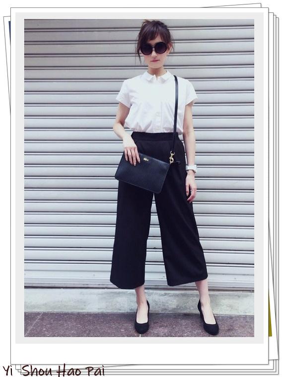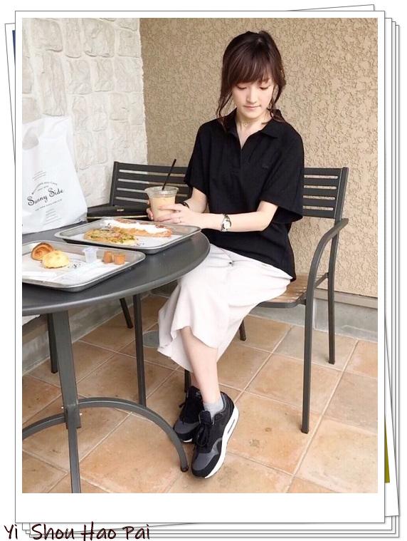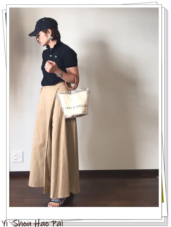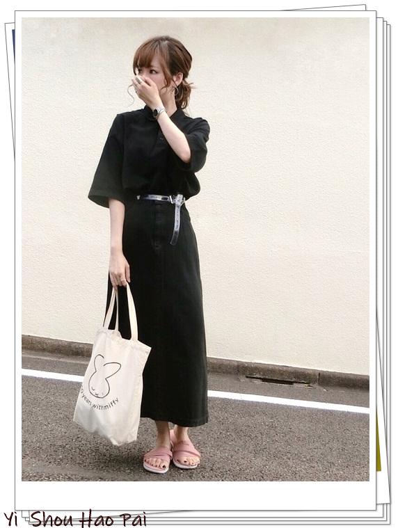 All black outfit, black tight skirt and black polo shirt. It is recommended to unify the colors of sandals and bags to increase the sense of unity in the look. Combine with brightly colored accessories for a youthful, pastel effect!