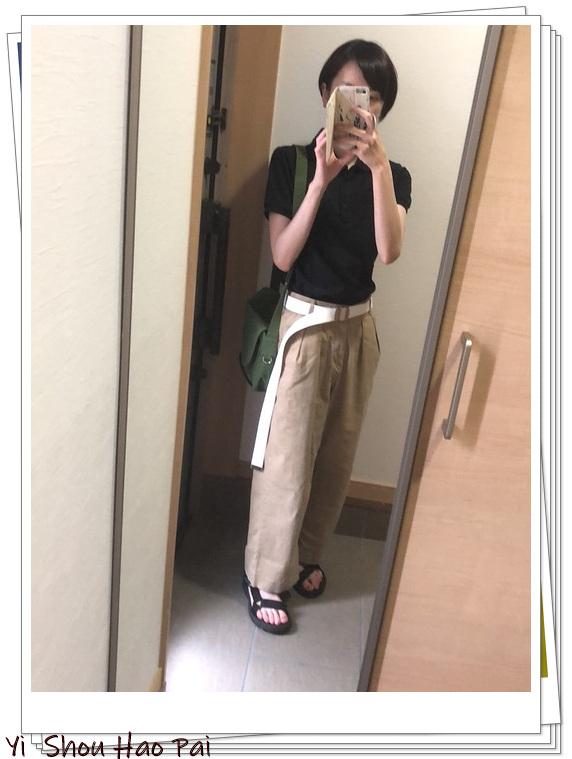 Combine the combination of loose chino pants and black polo shirt. The belt and sandals add a summery feel, so they work well when paired with the polo shirt. .