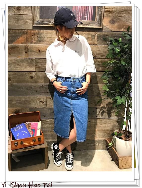 Combine a white polo shirt and a denim skirt, and add a casual feel by matching it with sneakers and a hat. Long sleeves create a calming vibe.