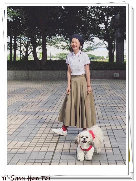 The fluffy long flared skirt and white polo shirt paired with white sneakers show a beautiful style. With eye-catching socks, you can feel free to show off your fashion statement.