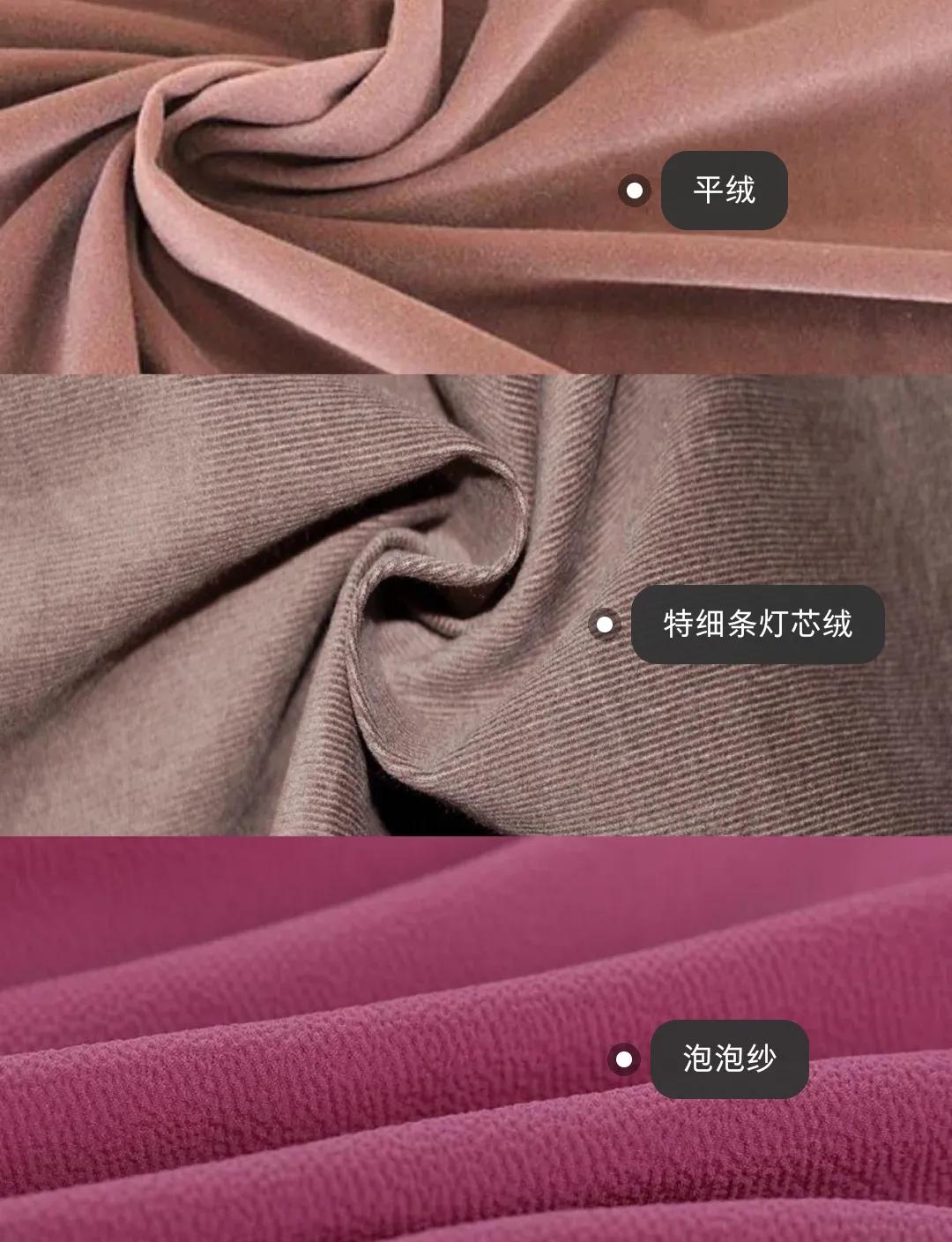 Velveteen: full and flat pile, thick texture, good warmth retention , wear-resistant and not easy to wrinkle, suitable for making shoes and hats and other fabrics