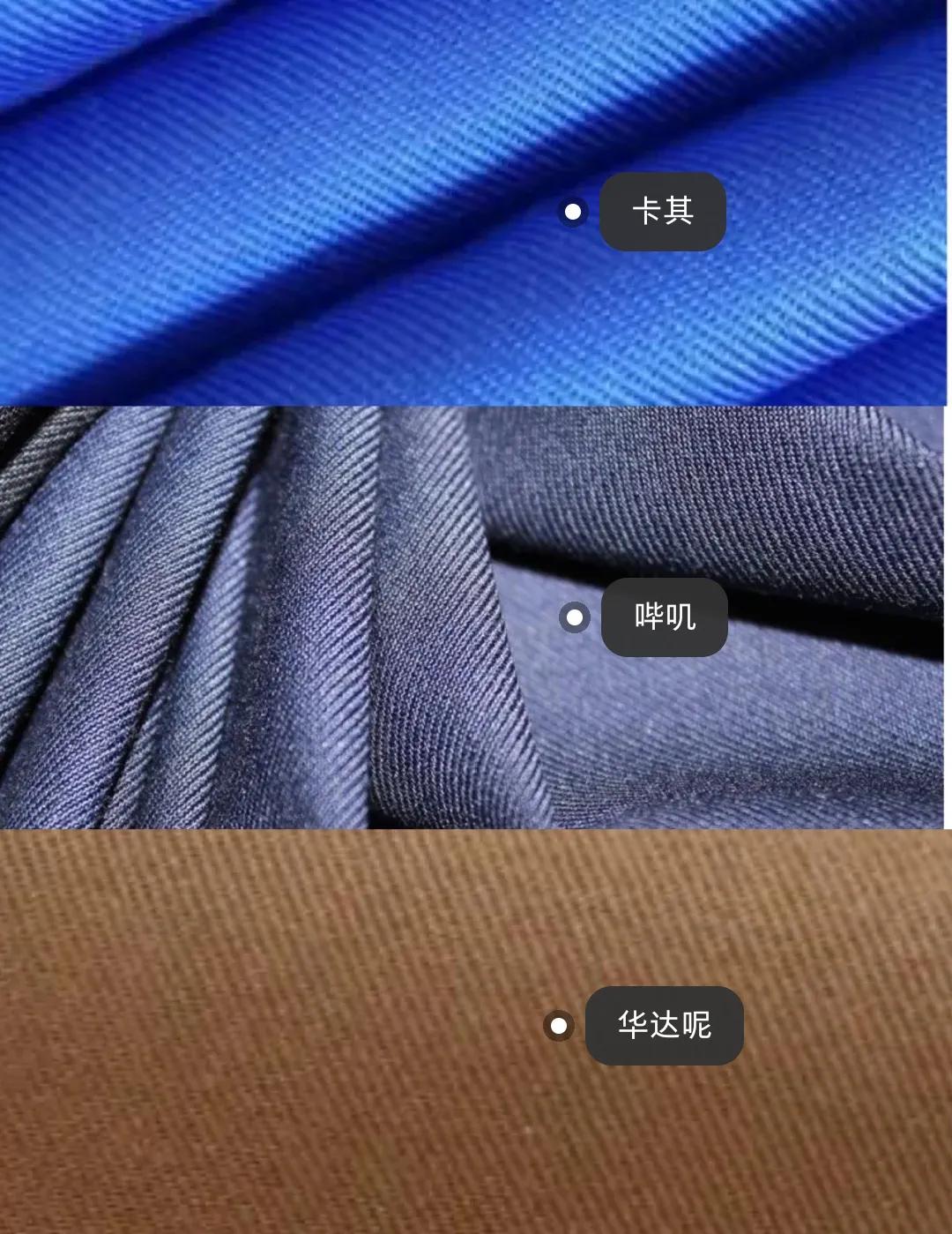 : gabardine : Also known as Gabieding, it has clear texture and thick texture. Stiff but not hard, the fabric surface is shiny, resistant to wear and tear without breaking, suitable for spring, autumn and winter uniforms, windbreakers, jackets, etc.